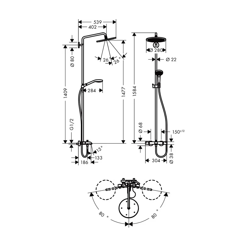 Верхний душ, ручной душ, термостат для ванны, штанга для душа, держатель для душа, душевая штанга