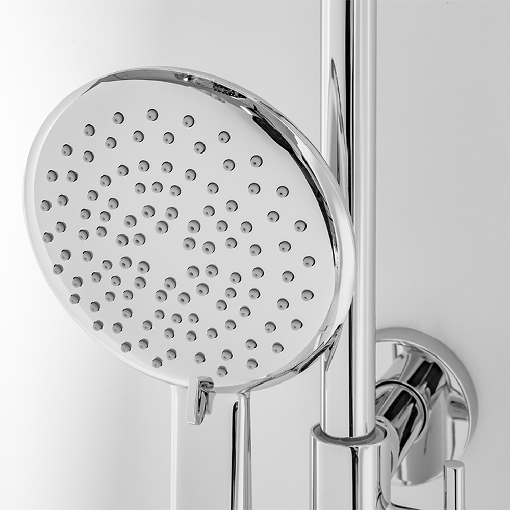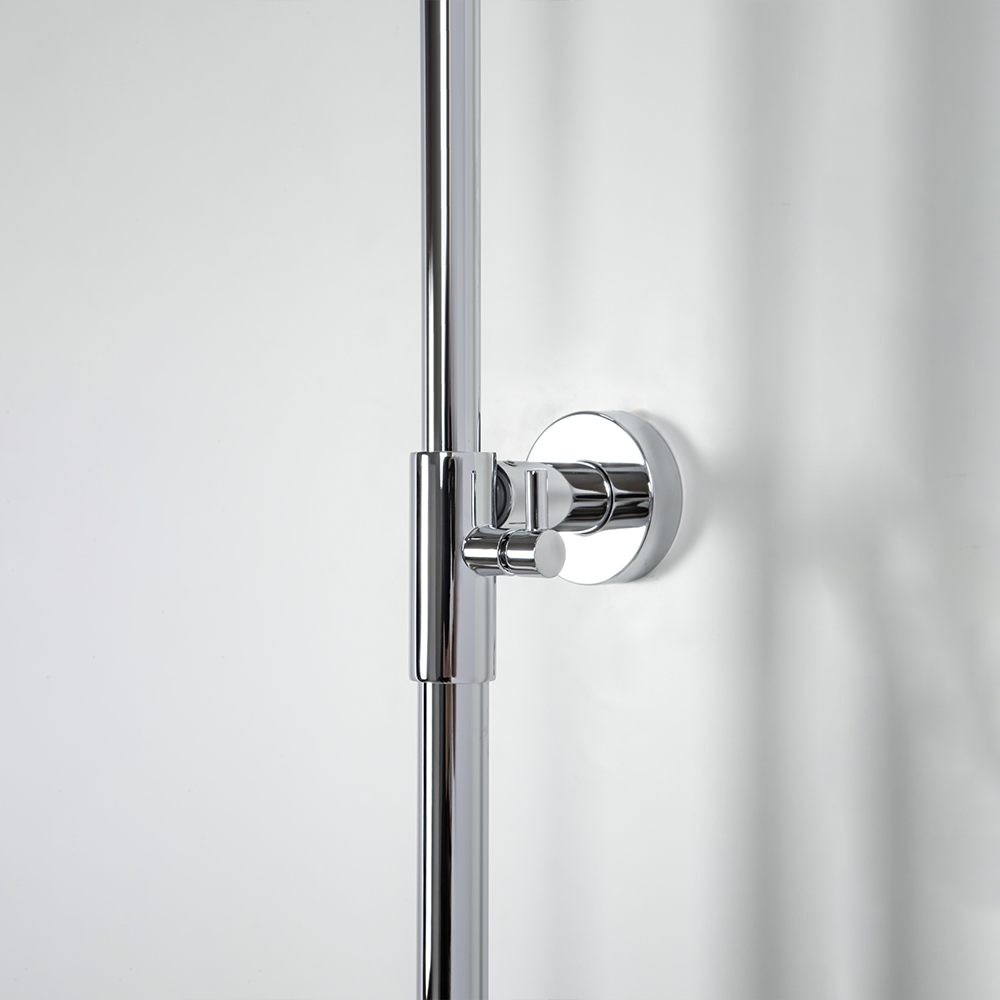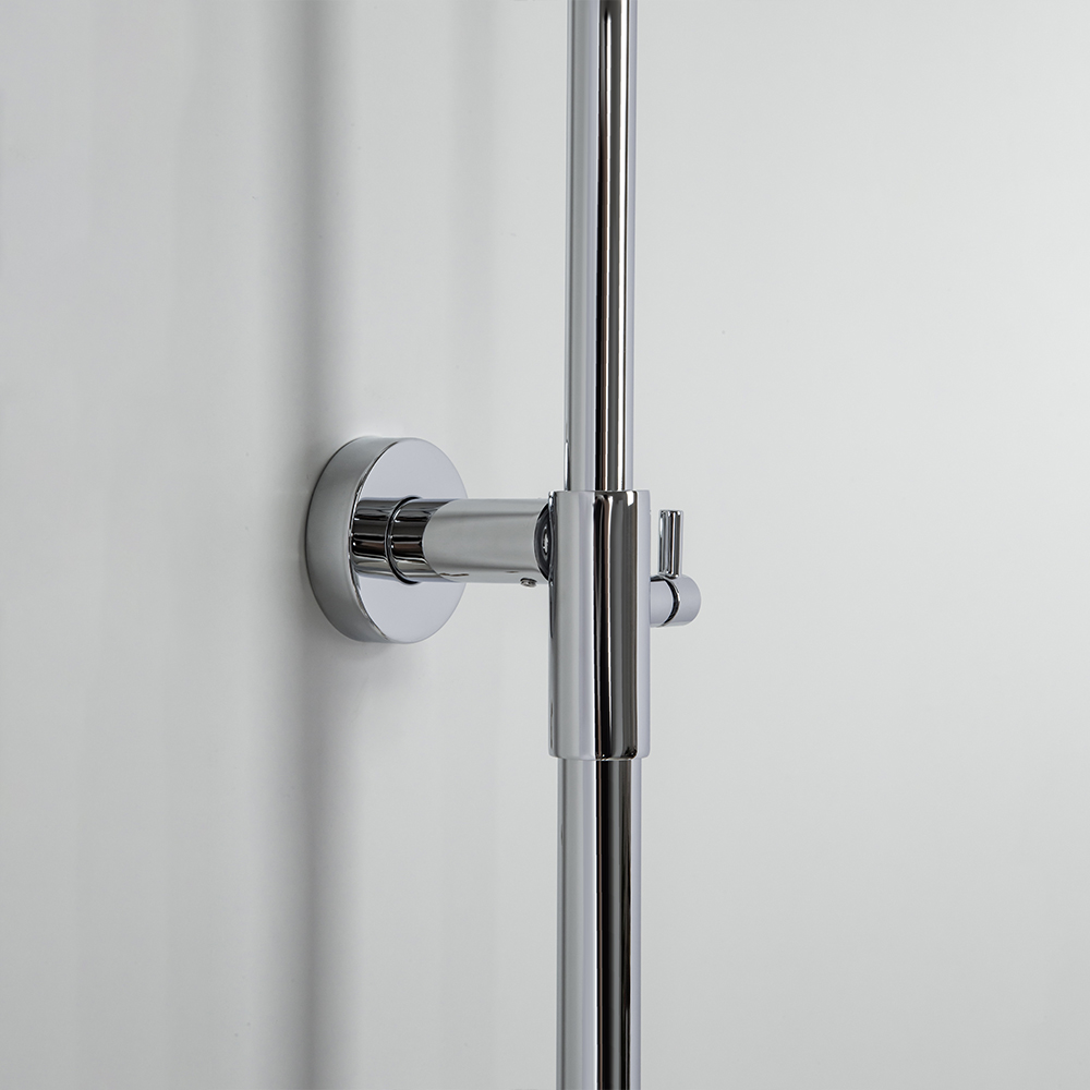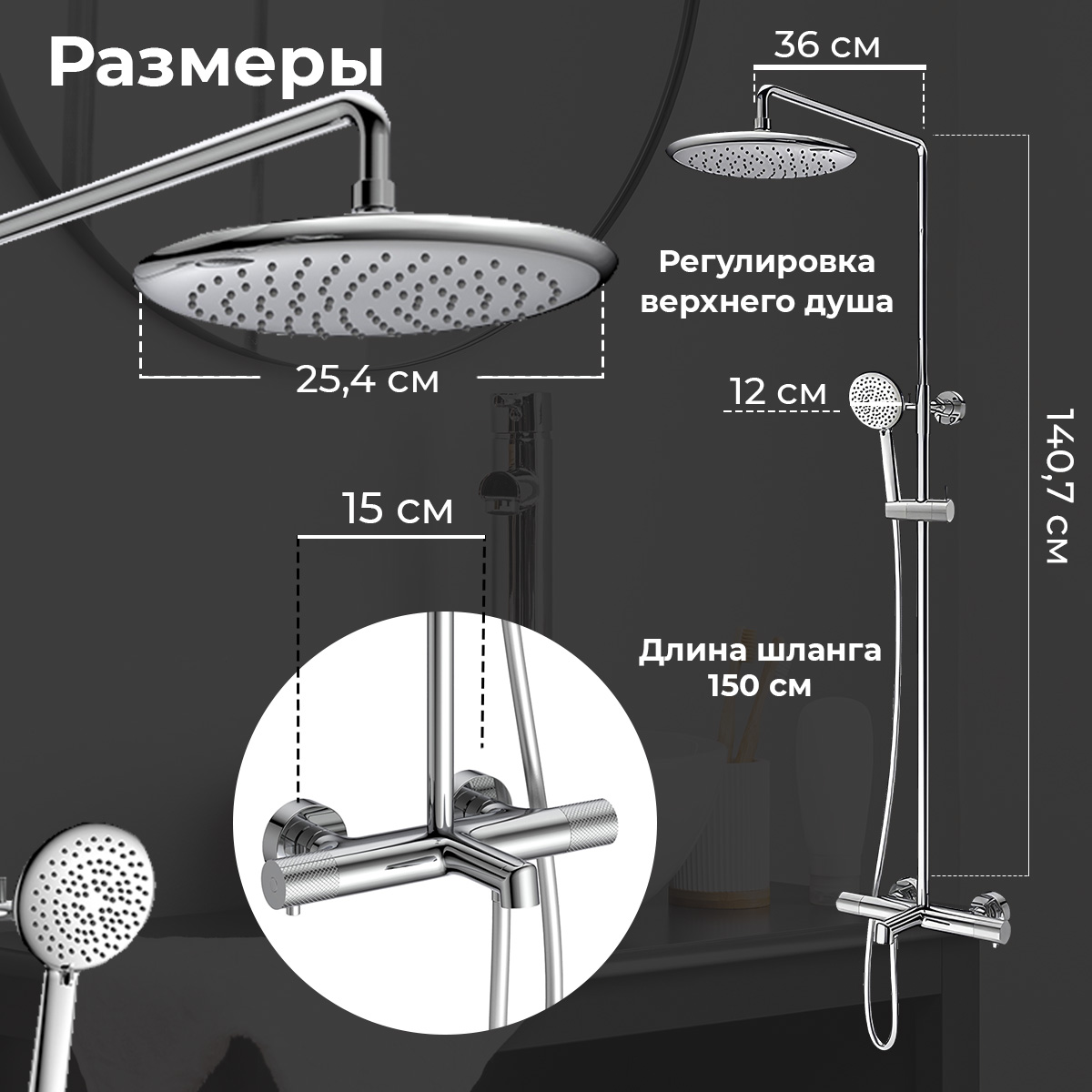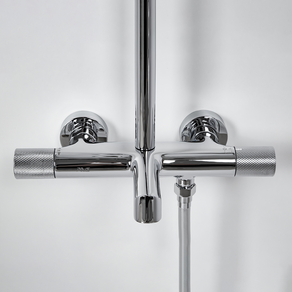 душевая стойка; комплект эксцентриков; термостат; верхний душ; душевой шланг; ручной душ; инструкция.