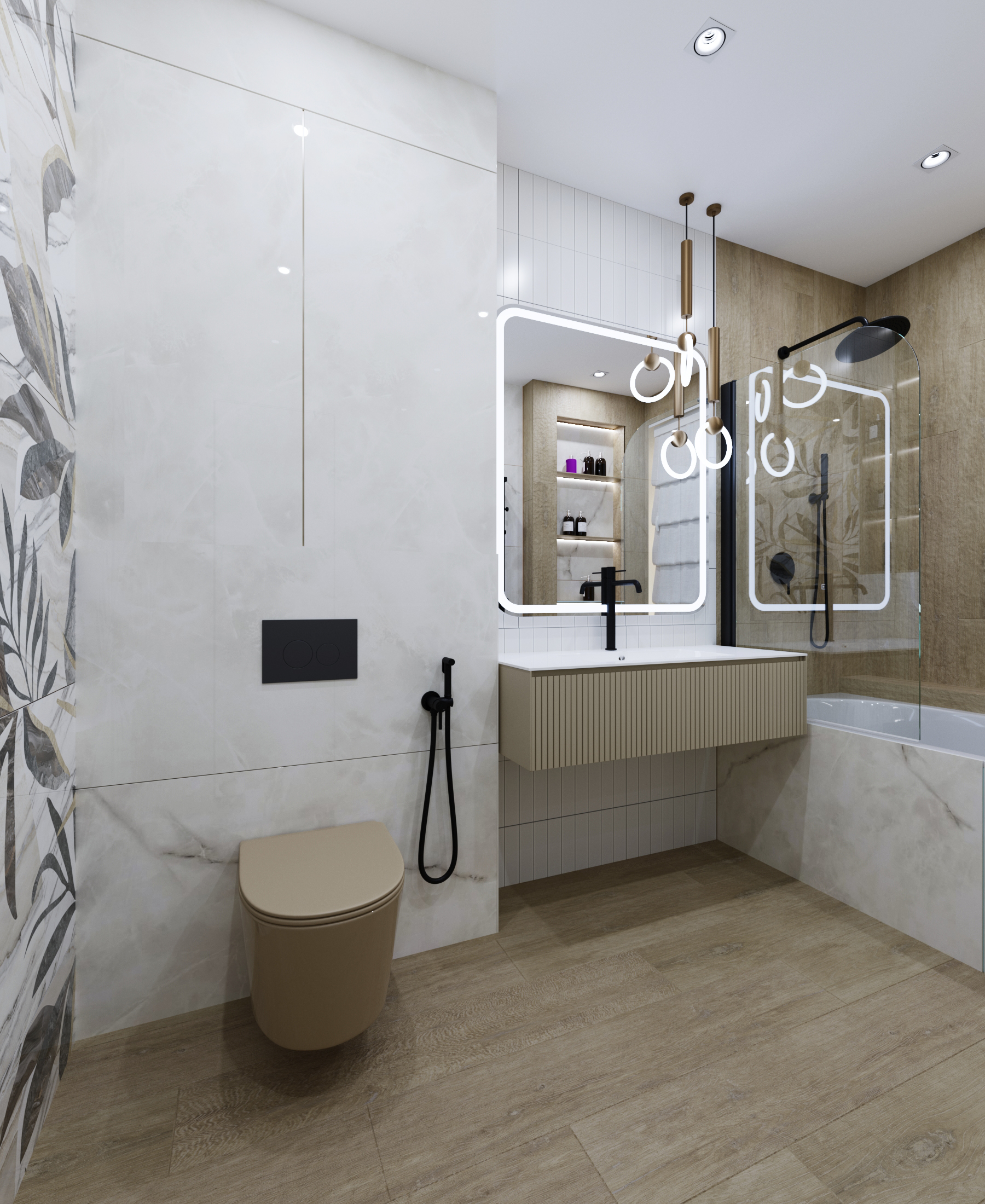 Оформлена в современном стиле для молодой семьи. Основной задачей было создать практичный, легкий и при этом светлый, красивый интерьер, но без значительных затрат. В качестве ключевого акцента выбран унитаз фирмы AVS пастельного оттенка, который эффектно контрастирует с черными деталями: смесителем, кнопкой смыва, душевой лейкой и полотенцесушителем. Для оптимизации пространства спроектирована ниша с полочками сбоку над инсталляцией, обеспечивающая удобное размещение принадлежностей для ванны. Современный выразительный интерьер сочетает в себе продуманную эргономику и утонченную эстетику.